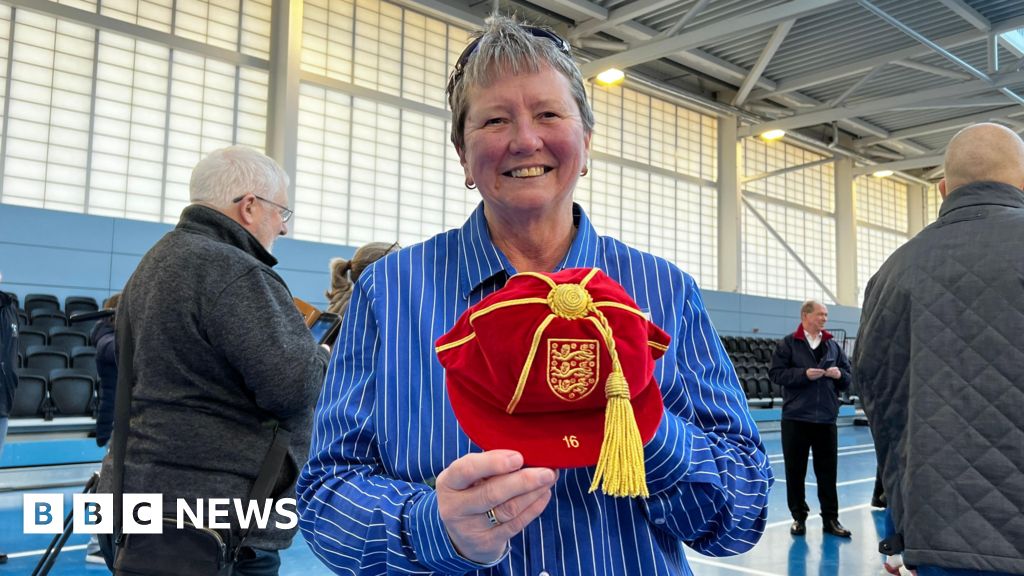 Marian McNamee/BBC A smiling Pat Mitchell-Firth wears a blue and white striped shirt and is holding a crimson velvet official Football Association cap with gold embroidery and brocade. It bears the number 16 and has the England three lions badge onMarian McNamee/BBC