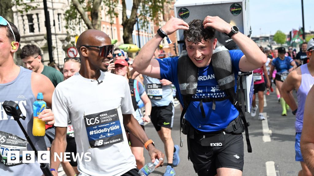 PA Media Jordan Adams wearing a blue t-shirt and black running shorts runs with a white fridge on his back surrounded by other runners. Mo Farah, wearing a white t-shirt and sunglasses, runs beside him.PA Media