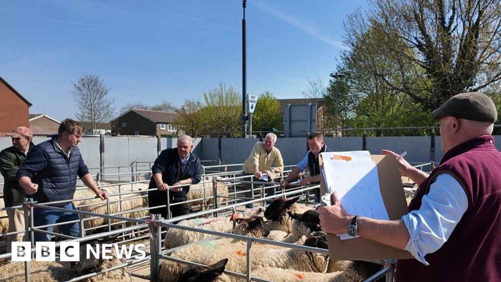 BBC A seller at Thame Market holding a pen and a clipboard with papers during a live auction. There are potential buyers lined up alongside pens with sheep. It is a sunny day.BBC