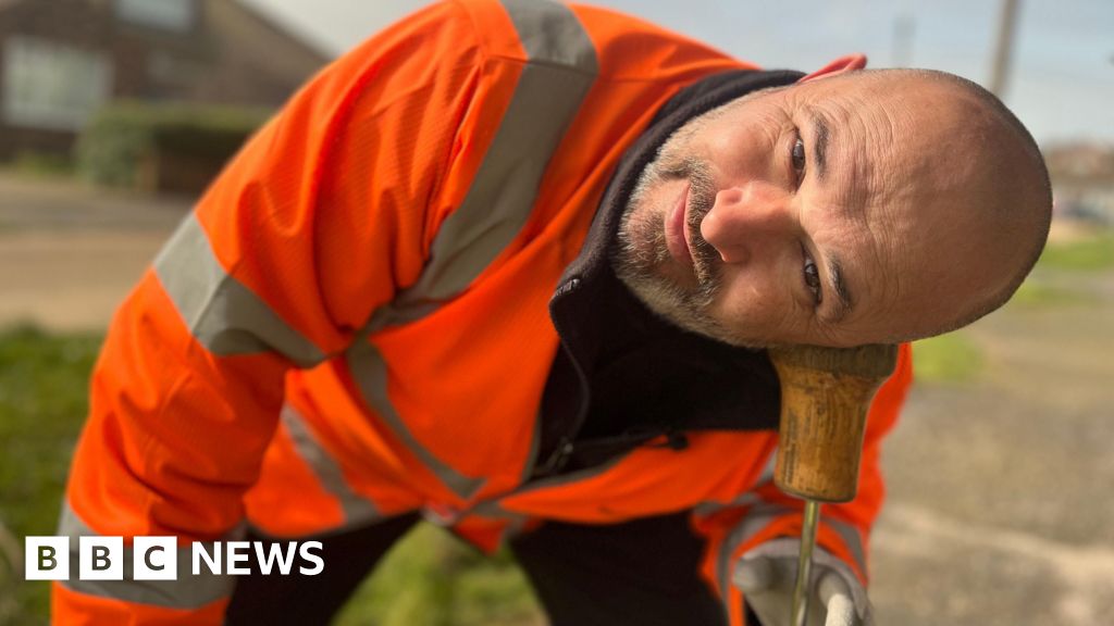 Fiona Irving / BBC A man with a white hardhat on smiles at the camera. He is wearing a high-vis orange jacket. Behind him is a residential street and a bungalow. You can make out green plastic barriers on the pavement.Fiona Irving / BBC