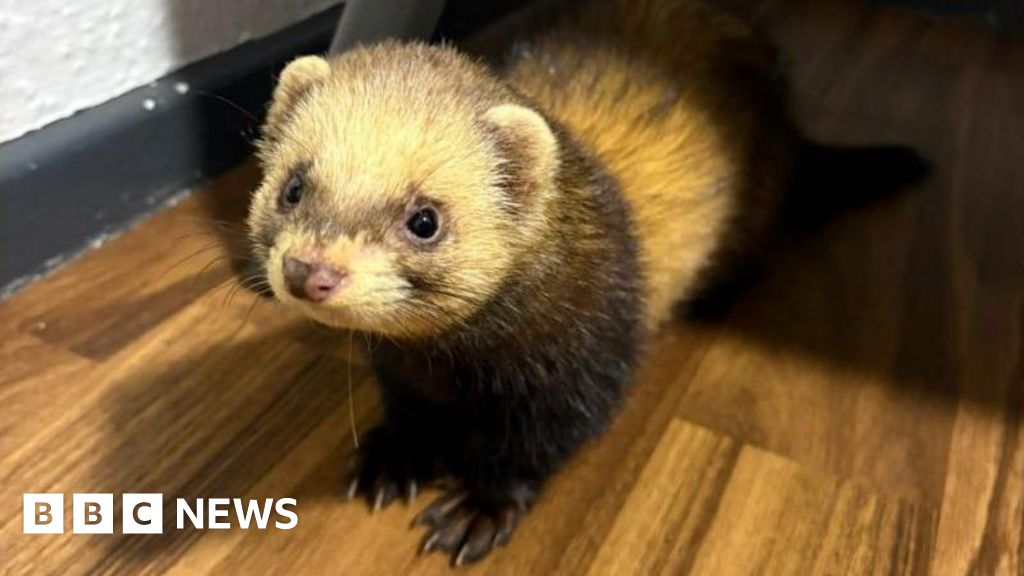 North Yorkshire Police The image shows a small ferret standing on a wooden floor indoors, close to a wall and furniture legs. The ferret has golden-brown fur with a darker face and legs, small rounded ears, and bright eyes. It appears to be looking directly at the camera, with its body low to the ground.North Yorkshire Police