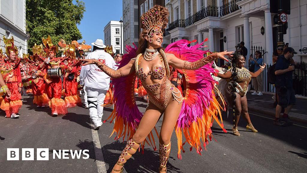 Getty Images A lady in a colourful carnival dress with elaborate headdress and feathered wings poses for the cameras on a street in Notting Hill. Behind her is a troupe of performers in the same costume.Getty Images