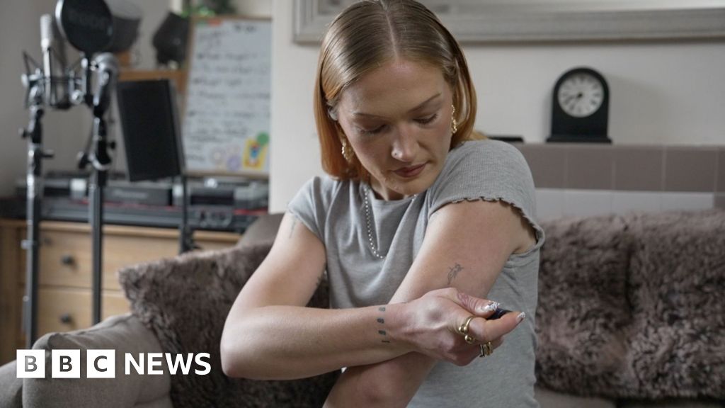 BBC Anna is pictured sitting on a grey sofa in her living room. She is injecting herself with an insulin pen. Anna is wearing a grey T-shirt and she has strawberry blonde hair. Over her left shoulder is a microphone on a stand, some DJ decks and a small whiteboard. BBC
