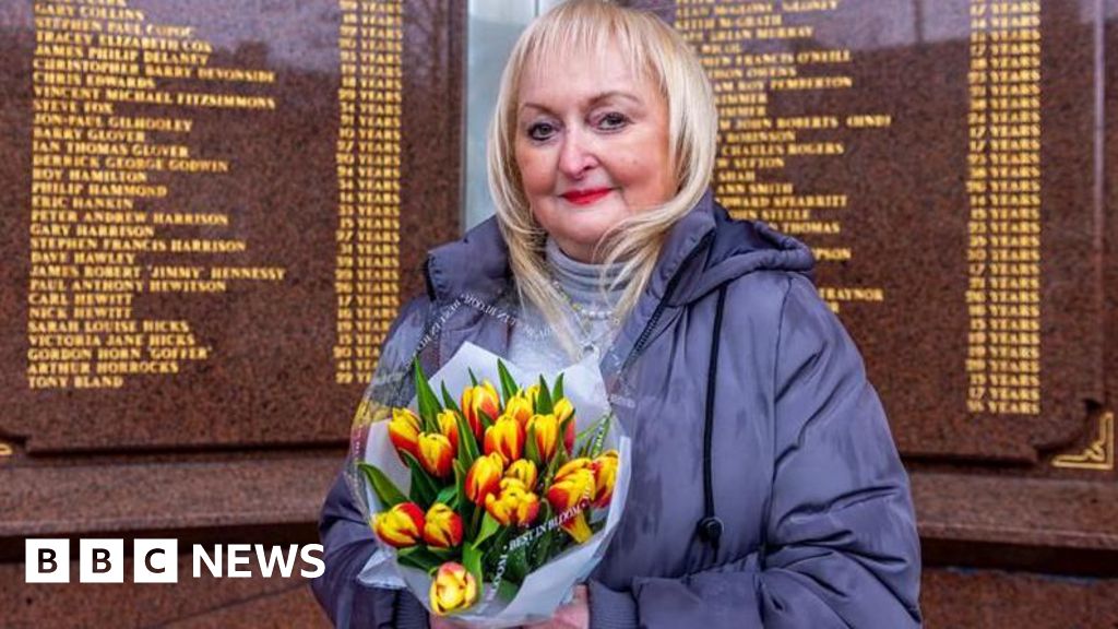 BBC Jenni Hicks, with blonde hair, red lipstick and wearing a blue coat, stands before the Hillsborough memorial which has the names of the 97 engraved in golden lettering, holding a bunch of tulips. BBC