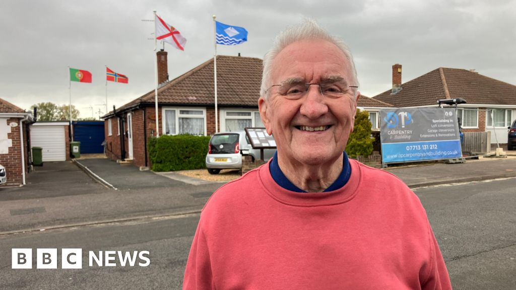 BBC A man in his 80s is wearing a pink jumper, standing outside of his house which has four flags flying above it. BBC