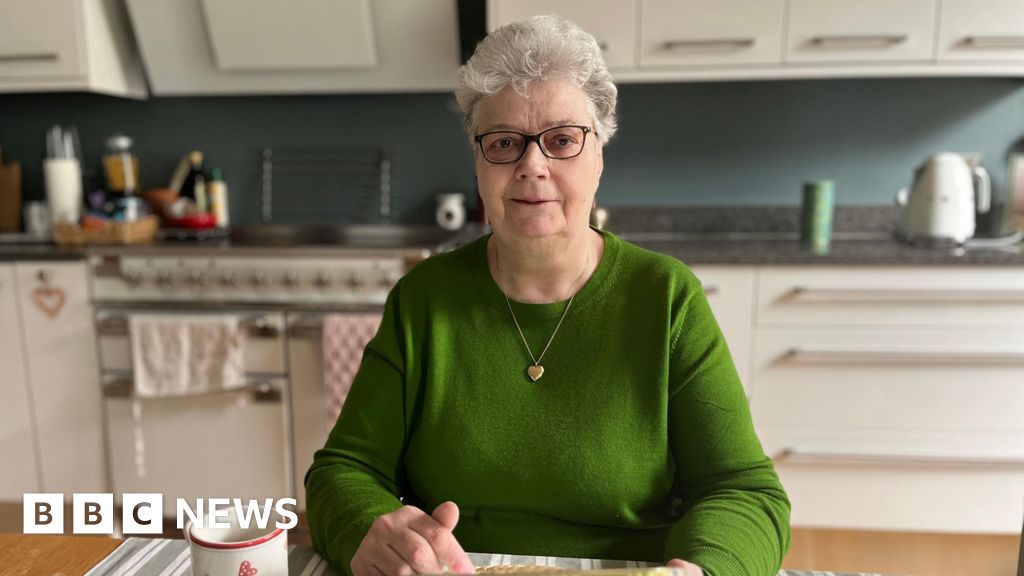 BBC Jennifer is a woman with white hair and black-rimmed spectacles. She is wearing a green wool jumper with a gold heart on a chain round her neck and is sitting in a modern kitchen.BBC