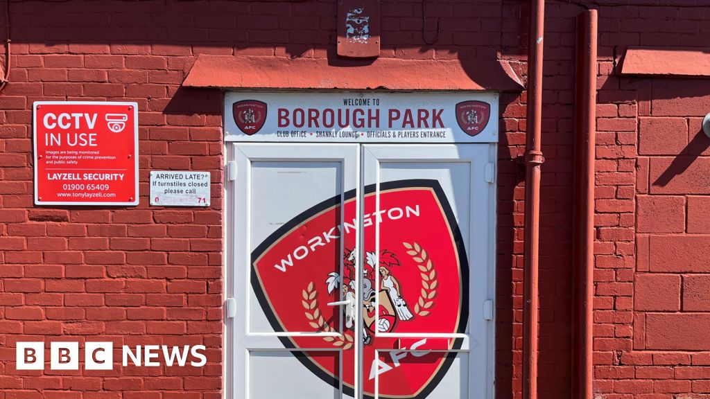 BBC The players' entrance at Borough Park in Workington. It is a white double door with the red badge of Workington AFC and across it. A sign above reads Welcome the Borough Park and lists those allowed to enter. It is set into the outer brick wall of the ground which has been painted a brownish red. A red sign warns of CCTV in use and sits next to a smaller white sign which gives a phone number for latecomers who have arrived after the turnstiles have closed.BBC