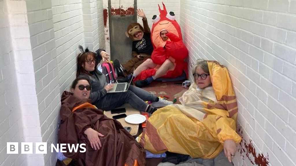 BBCVolunteers dressed in inflatable lobster, monkey, and cat outfits have been locked in kennels, and will not be released until £1,000 has been raised.