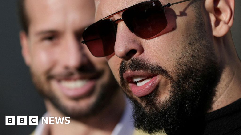 Octav Ganea/Reuters A head shot of Andrew Tate up close and just out of focus behind him is his brother Tristan. Sunshine is lighting their faces. Andrew is wearing sunglasses and has a black curly beard and Tristan has a similar beard. Andrew appears to be talking while Tristan is smiling. Octav Ganea/Reuters