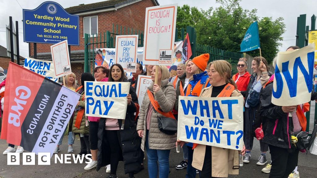 BBCSupport staff have walked out of 35 schools across Birmingham in an ongoing dispute over equal pay claims.