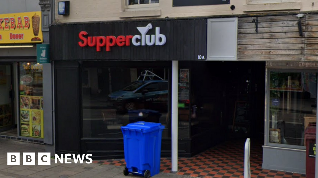 Google A general view of the exterior to SupperClub. The club's entrance is black with the name of the bar written above. A blue rubbish bin sits outside the entrance. Google