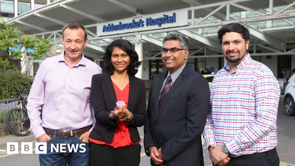 Cambridge University Hospitals NHS Foundation Trust )Dr Alex Samoshkin, Professor Sohini Kar-Narayan, Affiliate Associate Professor Vikas Khanduja and Dr Jehangir Cama stand side by side outside Addenbrooke's Hospital. They are all smiling and looking directly at the camera. Cambridge University Hospitals NHS Foundation Trust
