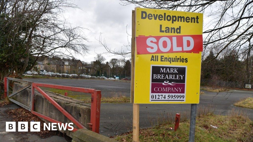 LDRS A large yellow sign above an empty, derelict car park reads 'Development land sold'LDRS