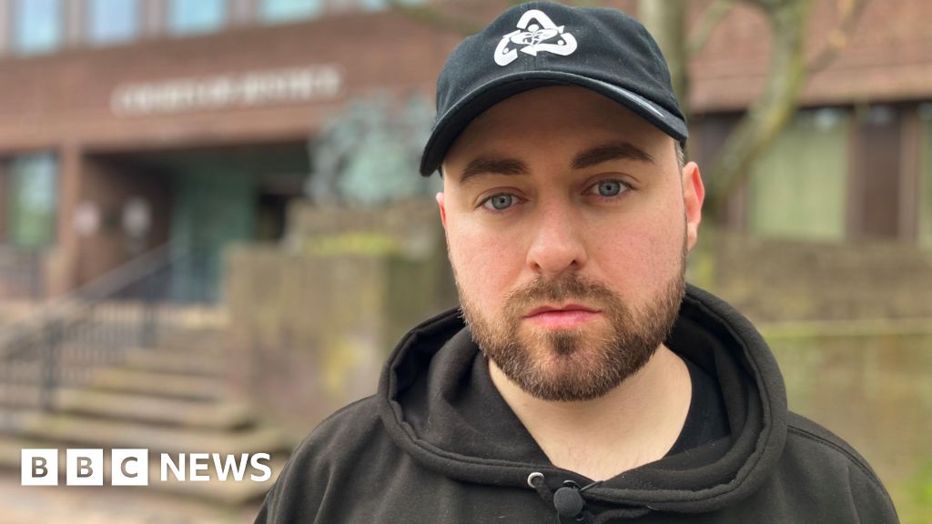 BBC Simon Cobb has brown stubble and blue eyes. He is wearing a black hoodie and cap. Behind him is Portsmouth Family Court.BBC