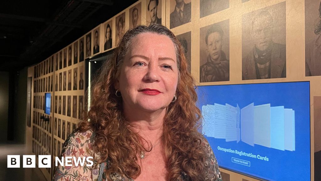 BBC A woman with long brown curly hair standing in front of a wall with a number of portrait black and white photos on itBBC