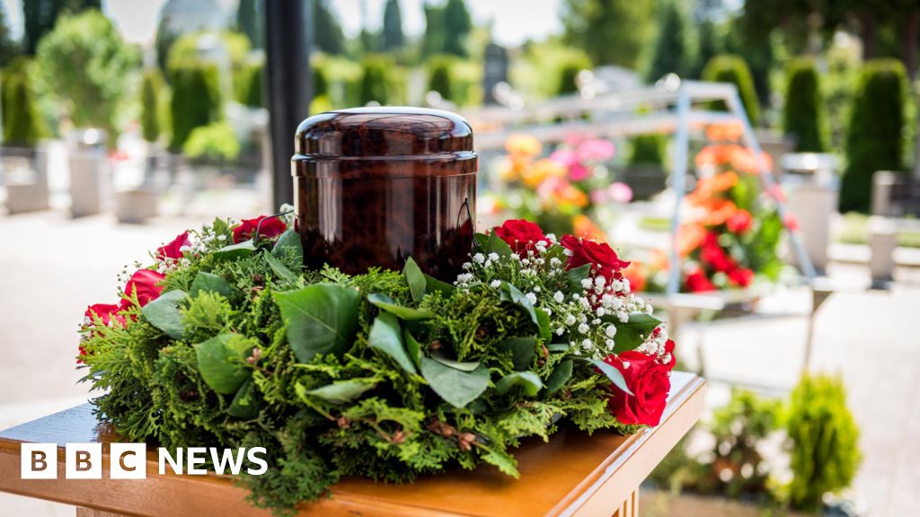 Getty Images A flower wreath around a urn sitting on a table. In the background there are other flowers on a metal structure.Getty Images