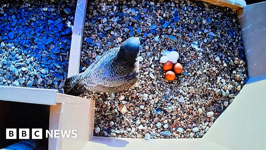 Pershore Abbey A webcam filming from above shows a grey peregrine falcon stood beside three brown eggs and a small white chick. Pershore Abbey