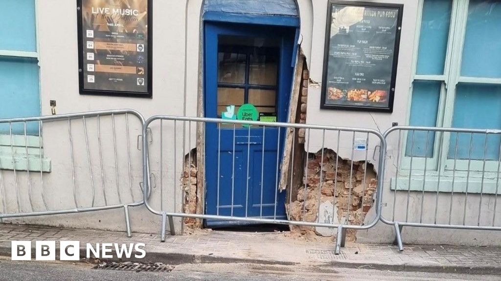 BBC The entrance to the pub fenced off, with the wall and door damaged.BBC