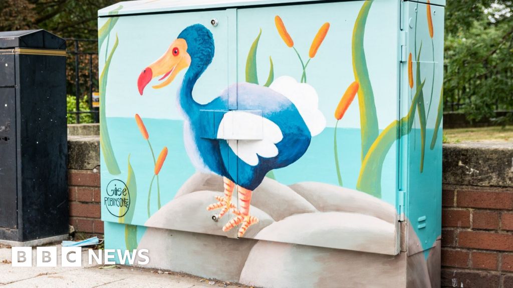 Shrewsbury BID A mural of a blue dodo painted on to a signal box in Shrewsbury. The dodo is standing on a grey rock surrounded by green reeds. In the background is blue water.Shrewsbury BID