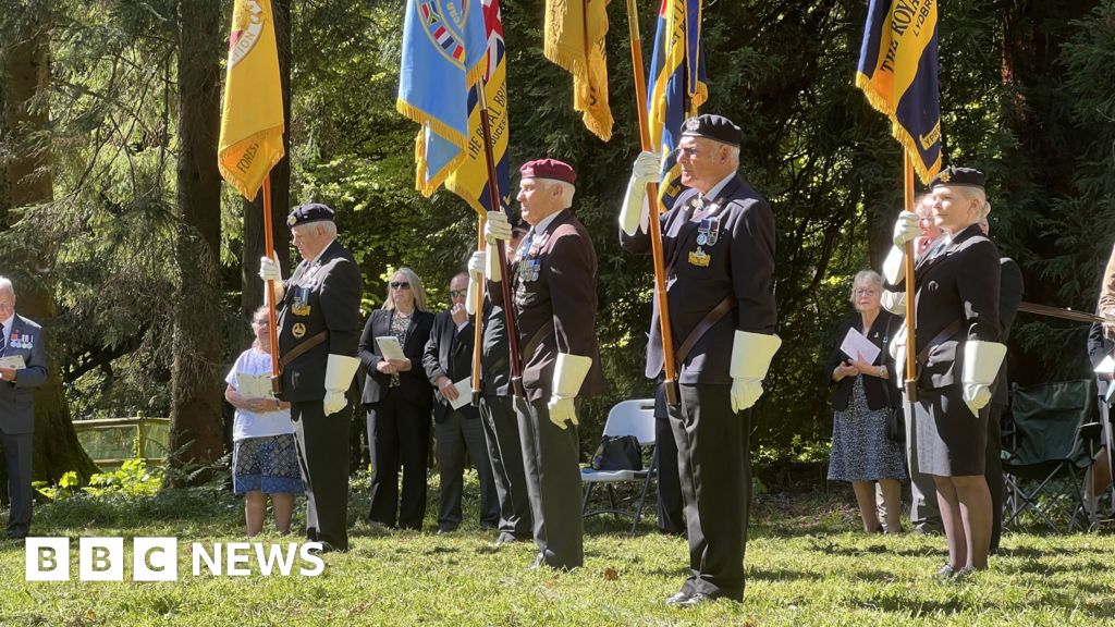 BBC A group of around six people standing on some grass below tall trees. They are wearing military uniforms and holding up large flags during a memorial ceremony on a sunny day.BBC