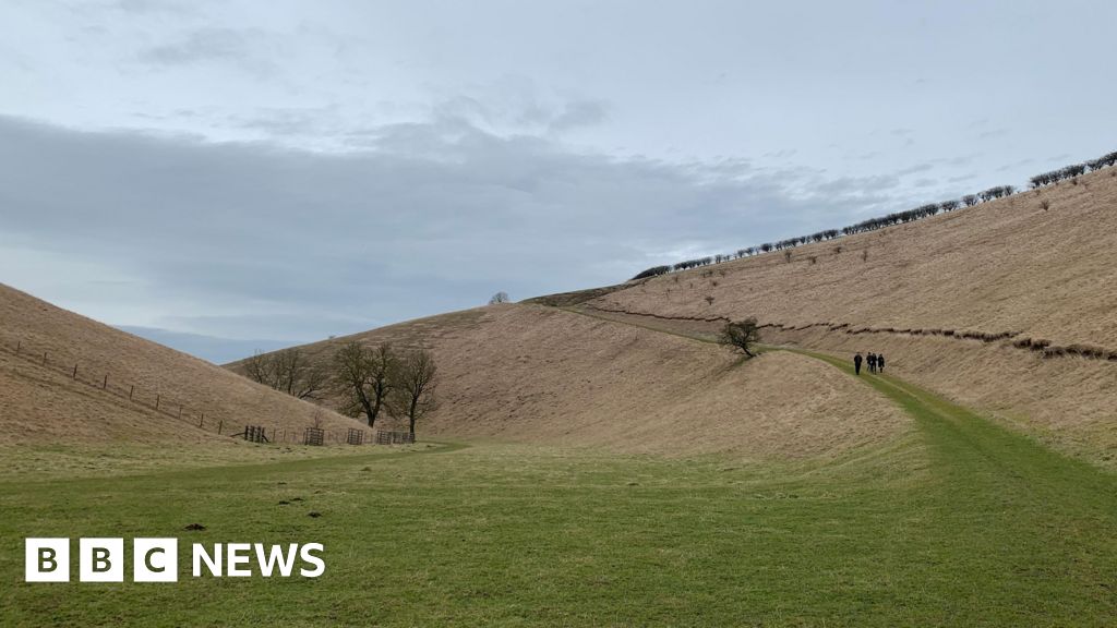 BBC A wide, open landscape with gentle grassy hills under an overcast sky. A narrow green path curves up the right hillside, where three small figures walk in the distance. Sparse trees and a fence line sit along the lower slopes, and the dry, beige grass contrasts with the green foreground.BBC