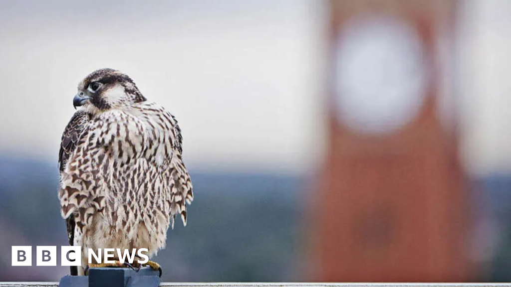 University of Birmingham A Peregrine Falcon perched in front of a tall clock tower.University of Birmingham