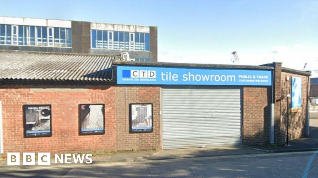 Google A single brick building with a blue banner over a shuttered garage saying tile showroom. It looks very run down Google
