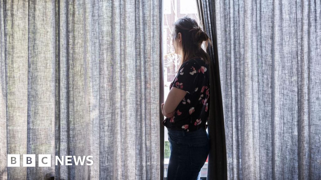 Getty Images A stock image shows a woman looking out of a window in between partially drawn curtains with her arms folded. Getty Images