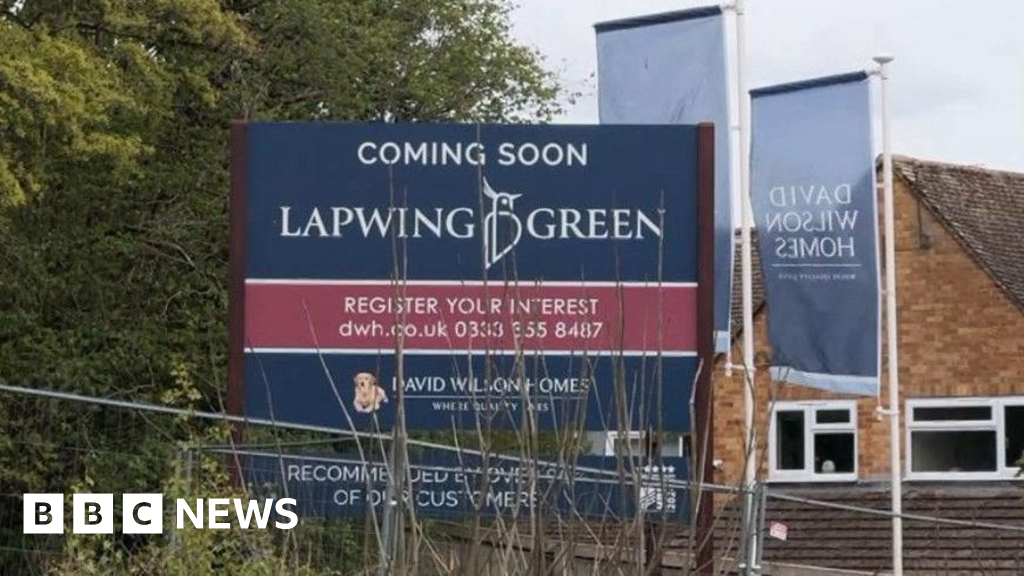 BBC Blue and red developer's sign which says, coming soon, Lapwing Green, register your interest.BBC