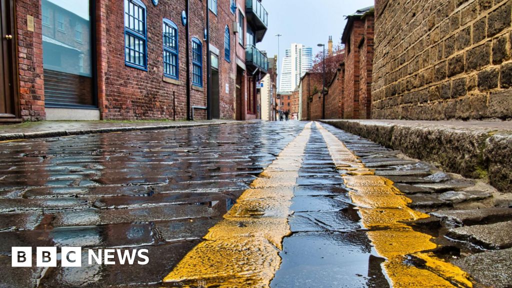 Getty A cobbled road with double yellow lines running down one side. There are buildings on either side of the road. Getty