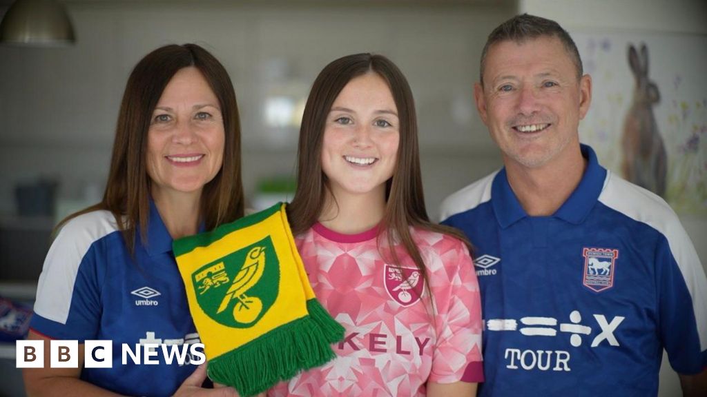 Jamie Niblock/ BBC Tracey King (left) wearing a Blue Ipswich Town shirt stands to the right of Eloise, and clutches her daughter's arm. She has brown hair. Eloise King has similarly brown hair, and stands between her mother and father. She is wearing a pink Norwich City kit, and has a yellow and Green Norwich City scarf over her shoulder. Chris King, stands to the left of his daughter, and is wearing an identical blue Ipswich Town shirt to Tracey. Jamie Niblock/ BBC