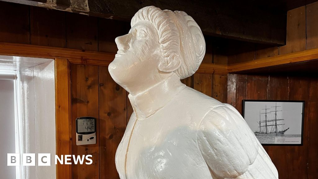 Getty Images The figurehead is white with yellow hair. There a pieces of it that have fallen off exposing wood underneath. The figurehead is next to the sea, which is visible in the distance under a dark blue sky.Getty Images
