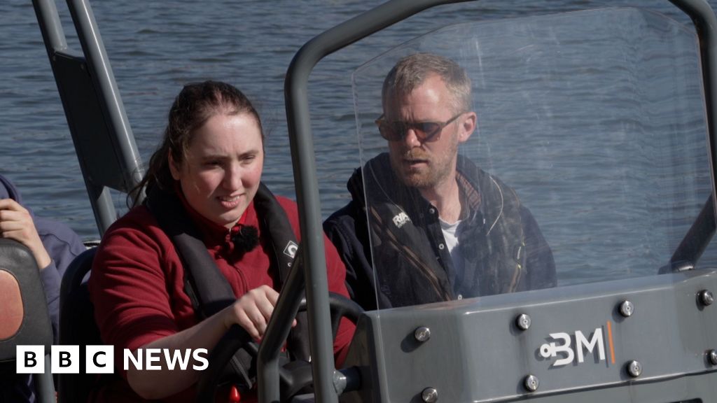 BBC A young women next to an instructor at the wheel of a RIB speedboat. BBC