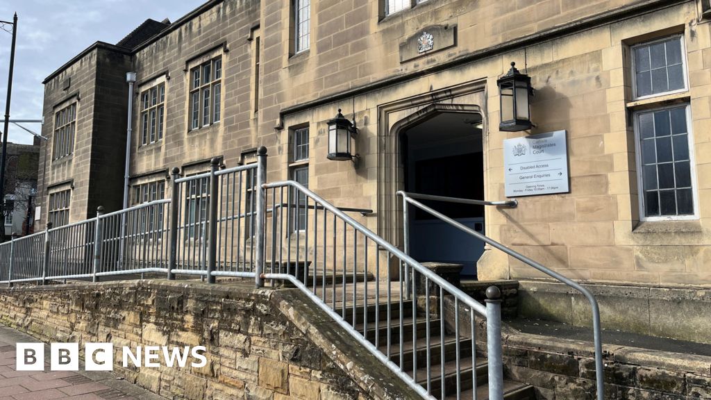 BBC The entrance to the magistrates' court in Carlisle. Steps lead up to the arched entrance of the sandstone building, which has a sign for the magistrates' court.