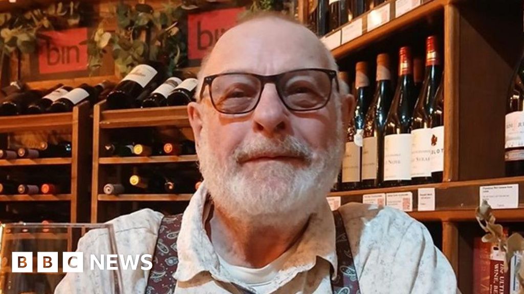 Handout Ken Langley has short grey hair and a grey beard. He is wearing dark framed glasses and a white t-shirt, white shirt and paisley patterned braces. He is holding a wine glass and is sat in front of shelves full of wine bottles.Handout