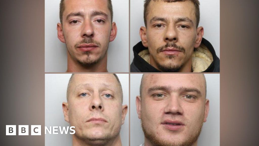 South Yorkshire Police Police mugshots of four men. On the top left is a man with sunken brown eyes and stubble. On the top right is a man with brown eyes, stubble and a black hooded coat. On the bottom left is man of around 40 with blue eyes. On the bottom right is a man with no hair and stubble. All four are staring directly into the camera.South Yorkshire Police