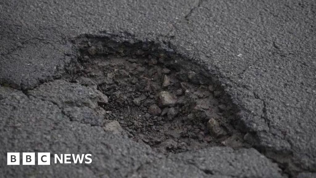 BBC A close‑up view of a pothole in a road surface. It shows cracked edges and exposed loose stones within the damaged tarmac.BBC