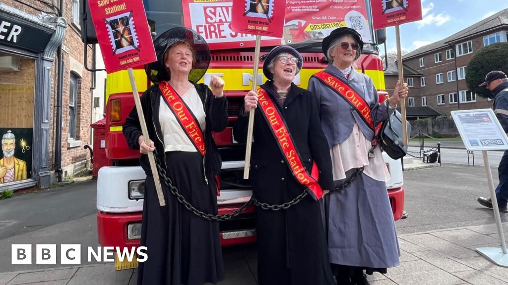 BBCCampaigners opposing plans to close fire stations have chained themselves to a fire engine dressed as suffragettes.