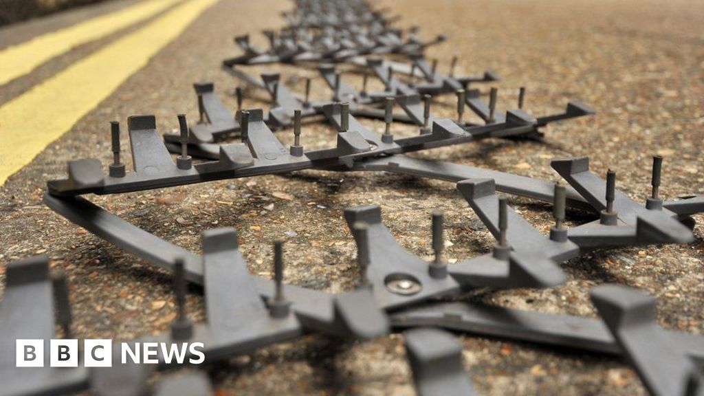 Alamy General view of a police stinger spike strip deployed on a road next to some double yellow lines.Alamy