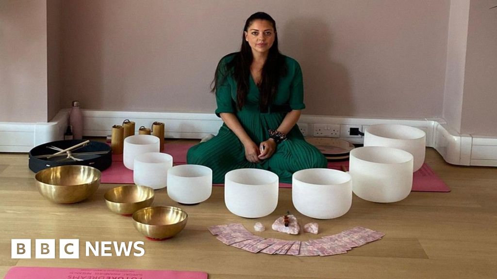 Pink Ladies/Future Dreams A woman in a green dress sits cross legged in front of pink yoga mats, white bowls and gold bowls before a wellness class. Two large pot plants are either side of the woman, who has long straight black hair.Pink Ladies/Future Dreams