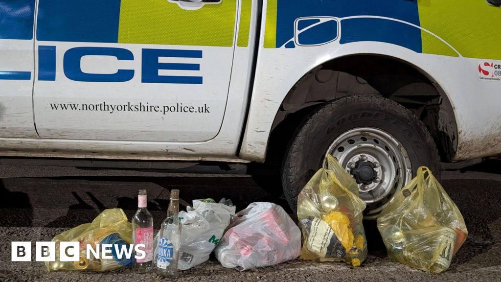 North Yorkshire Police Five carrier bags of rubbish are on the ground by a police car, three yellow bags and two white ones. They are full of cans and glass bottles, with two glass bottles sitting in front of one of the bags. North Yorkshire Police