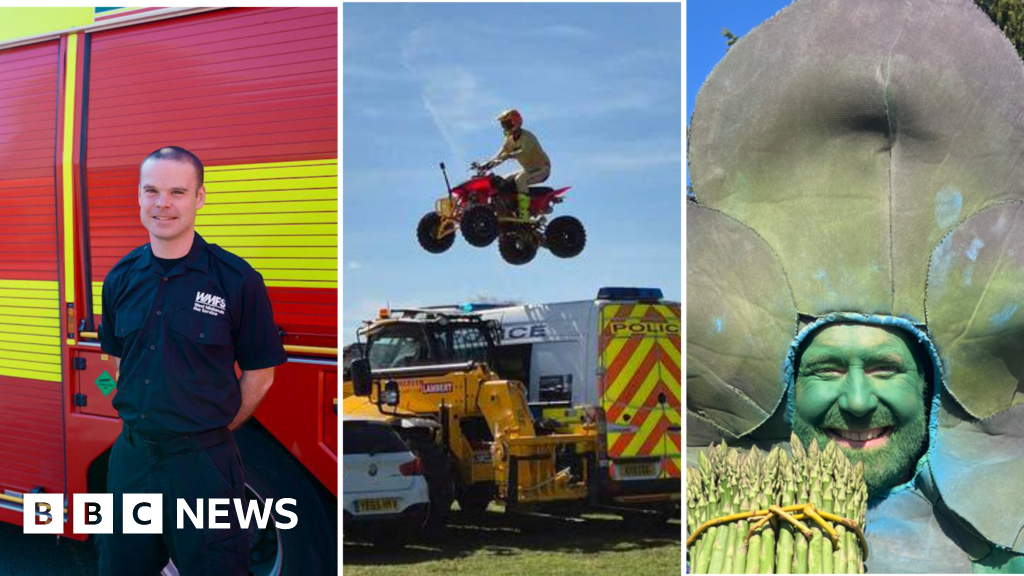 West Midlands Fire Service/Sam Coulter/BBC A three‑panel image showing a firefighter standing in front of a fire engine, a person riding a quad bike in mid‑air near emergency vehicles, and a person wearing a large vegetable costume with asparagus visible.