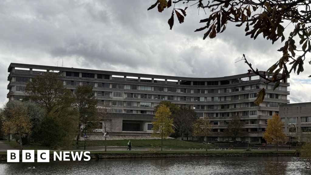 Steve Hubbard/BBC A large, curved concrete building with multiple rows of windows stands behind a grassy area and a pond. The building is Bedford Borough Council's headquarters. Several trees with autumn foliage are scattered across the scene, and branches frame the top of the image. The sky is overcast, creating a moody atmosphere, and a few people can be seen walking along the path near the water.Steve Hubbard/BBC