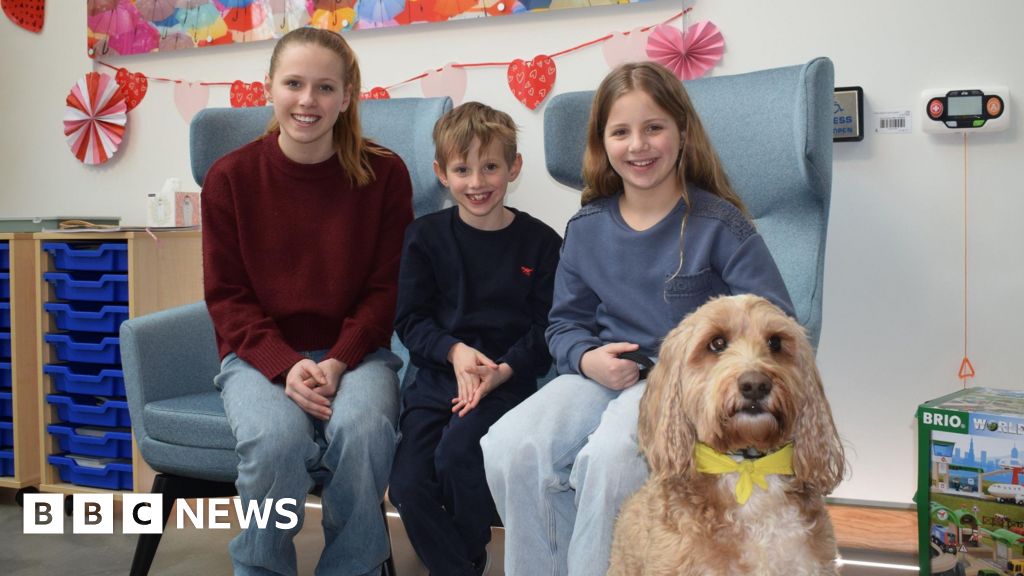 Leeds Teaching Hospitals NHS Trust Three children smile at the camera as they sit on a blue chairs in a white-painted room with colourful decorations. In front of them sits a golden coloured dog with floppy ears wearing a yellow bow round its neck.Leeds Teaching Hospitals NHS Trust