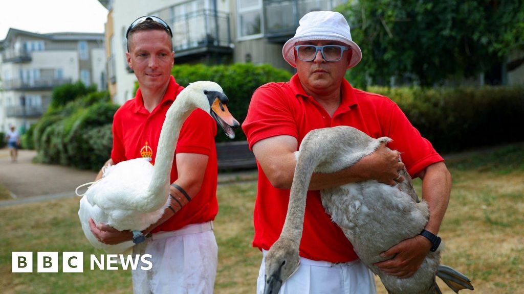 Reuters Two men dressed in red shirts and white trousers, one holding a swan and one holding a cygnet. There's greenery and residential buildings behind them.Reuters
