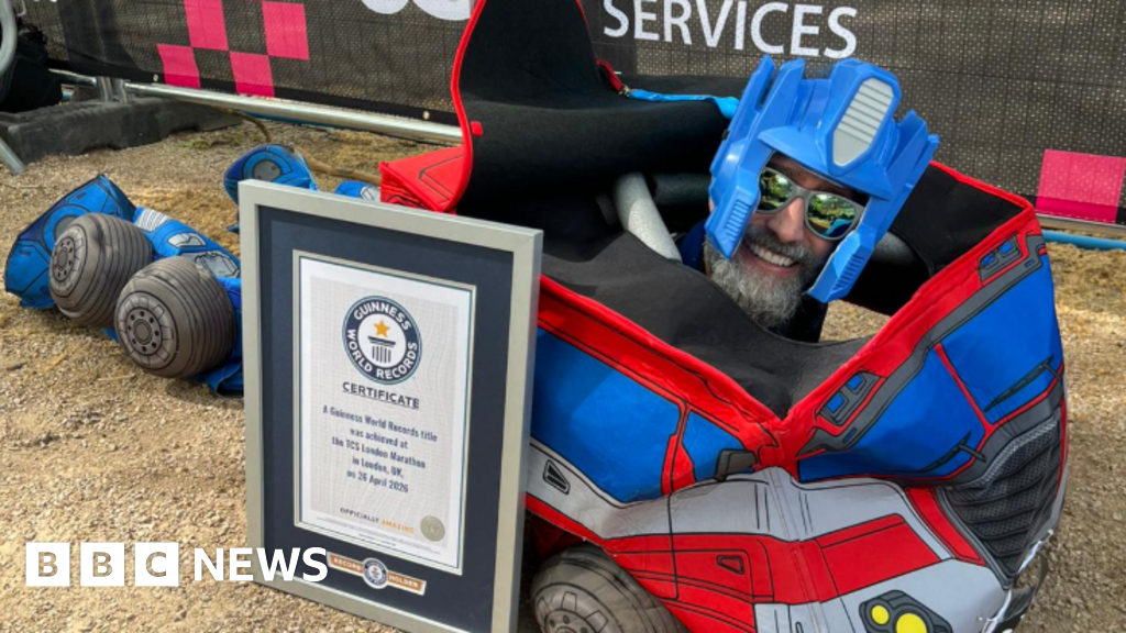 Guinness World RecordsA man who ran the London Marathon dressed as the Transformer, Optimus Prime, has broken a Guinness World Record.