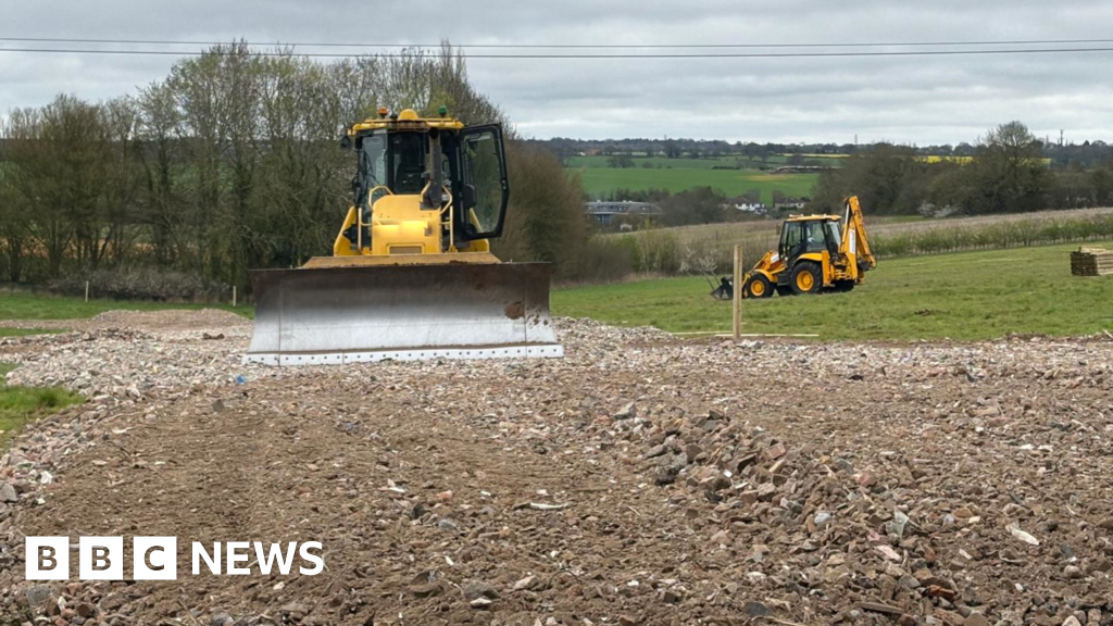 BBC A yellow bulldozer faces the camera with its silver scraper at the front. It sits on a large area of soil that is amid a grassy field, and the soil appears to have been recently turned over. There are trees and fields in the background.BBC