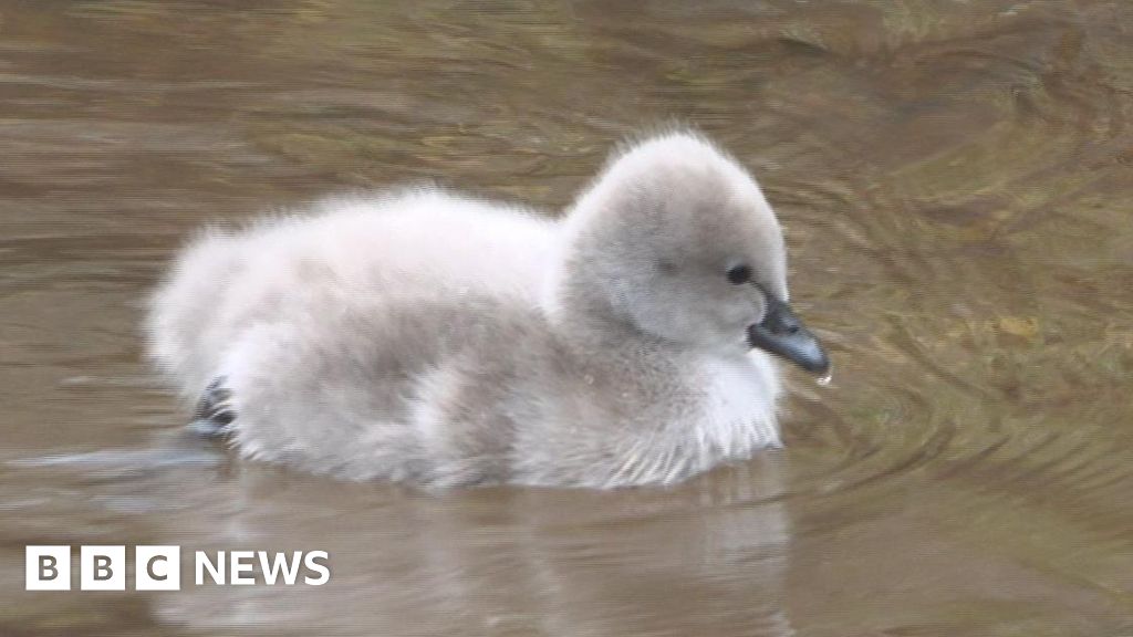 BBC The image shows a fluffy grey cygnet, with a black beak, swimming in a river. The water is calm.BBC
