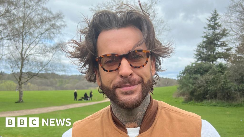 Alicia Owen/BBC Pete Wicks has a big floppy brown fringe which is windswept, thick framed glasses and is wearing a brown vest jacket. Behind him is the grass lawns of the country park and trees.Alicia Owen/BBC