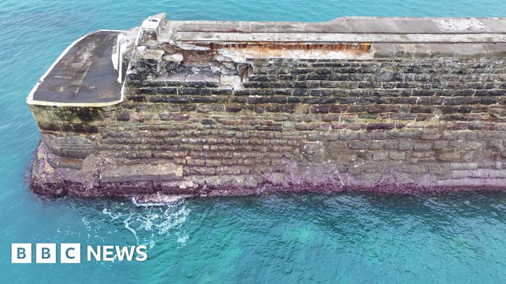 States of Guernsey A breakwater of grey bricks is seen surrounded by blue-green sea, with damage to the breakwater visible in the form of missing sections. States of Guernsey